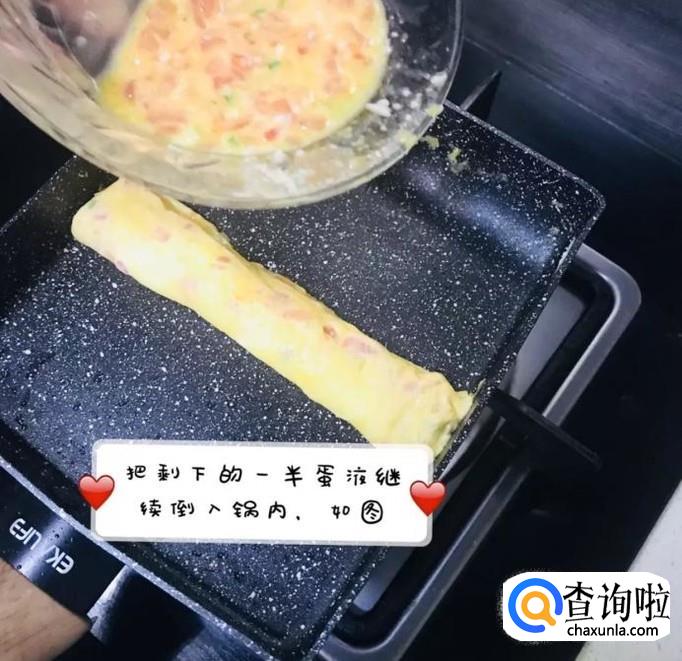 然后把另一半的蛋液倒入锅中,煎至定型,如下图所示。