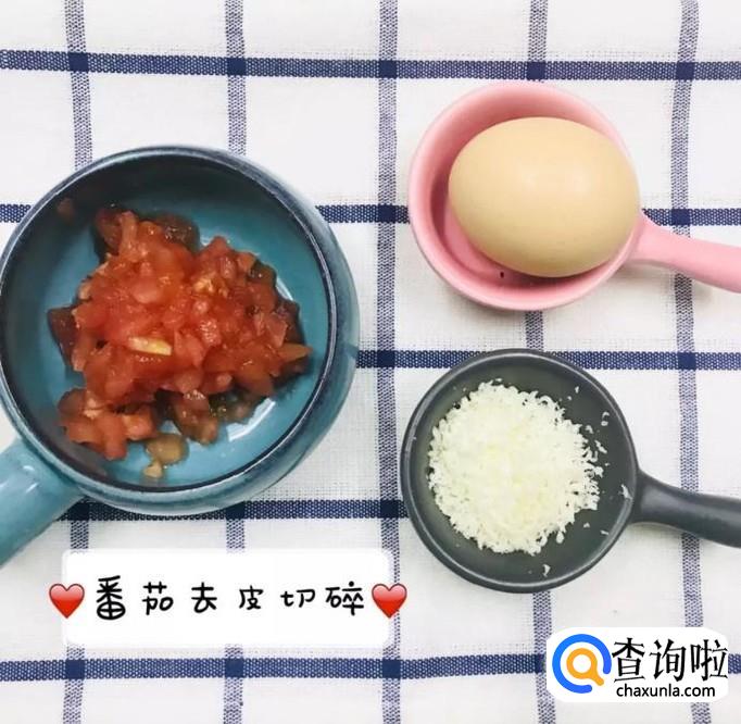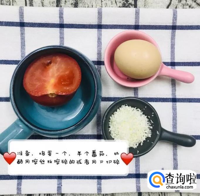 首先准备好要用到的所有食材,如下图所示。小贴士:番茄半个,鸡蛋一个,奶酪插成丝或者是用刀剁碎。