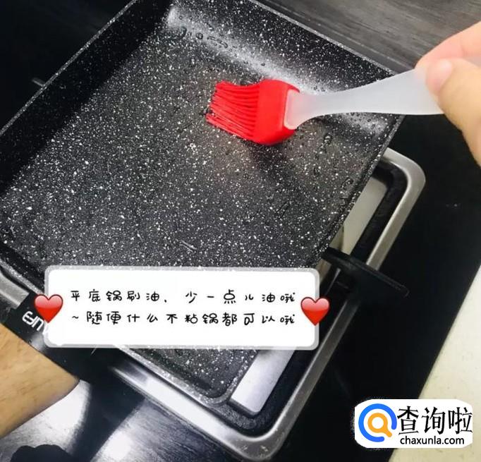 然后在不粘锅中刷上一层油,如下图所示。小贴士:关于油的选择,大家可以使用食用油或者是其他的一些油都是可以的。