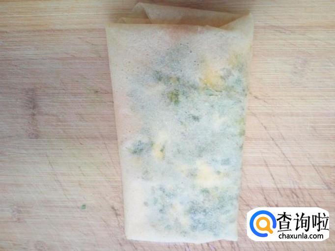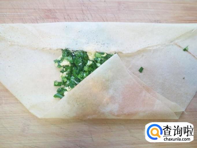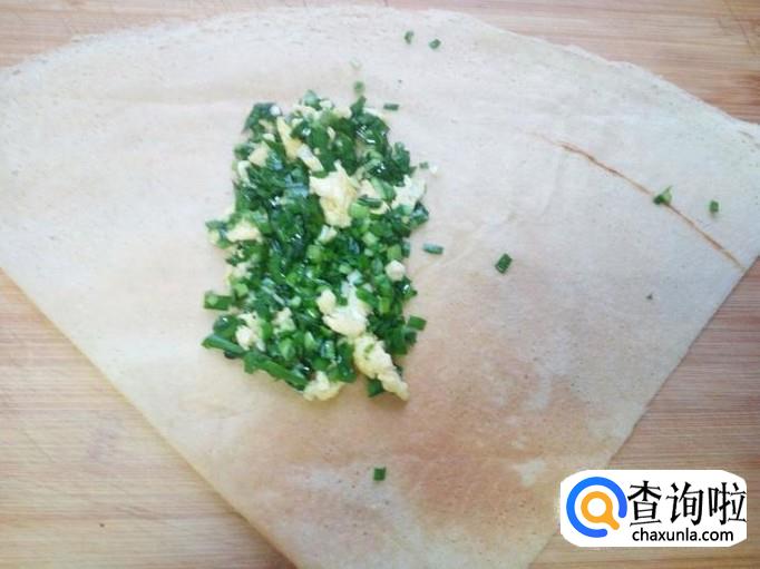 把拌和好的韭菜馅,放入煎饼上,上下折叠,包住韭菜馅,两边再对折包住韭菜馅。然后中间为轴再对折一下成为煎饼盒子形状(放韭菜馅的时候,略偏放一下,留出对折的空间)。