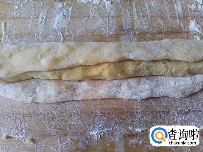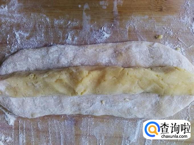 把发酵好的面团拿到案板上,压成长饼状,再用绿豆蓉揉搓成圆柱长条,放到面饼里。