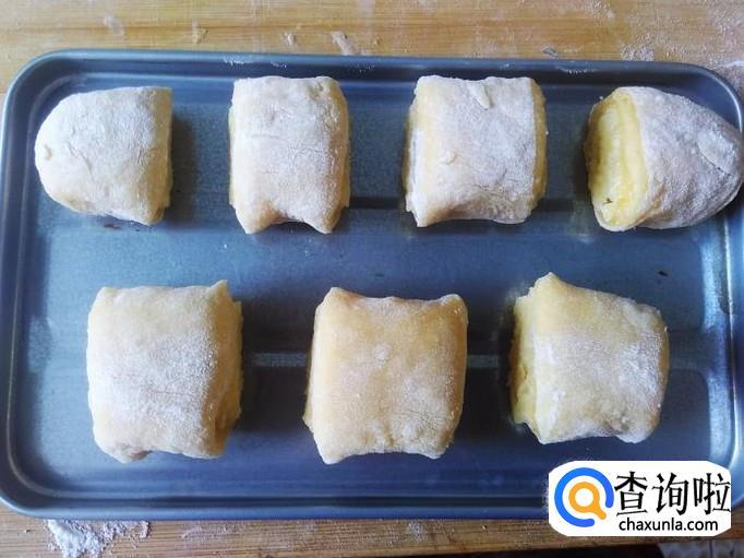 用刀切成一段段,放到烤盘。