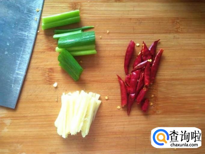 准备一些葱和一小块生姜,小葱切成段,生姜切成片或者切成丝都可以,这个随你自己的心意。再找来一些红辣椒,干的红辣椒哈各位,用刀直接对半切一下就行了。