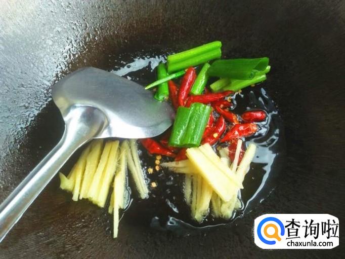 烧热油之后,把葱段、生姜丝以及干红辣椒全部放进锅里,不断进行翻炒。等到传出来很浓的香气的时候就可以了。