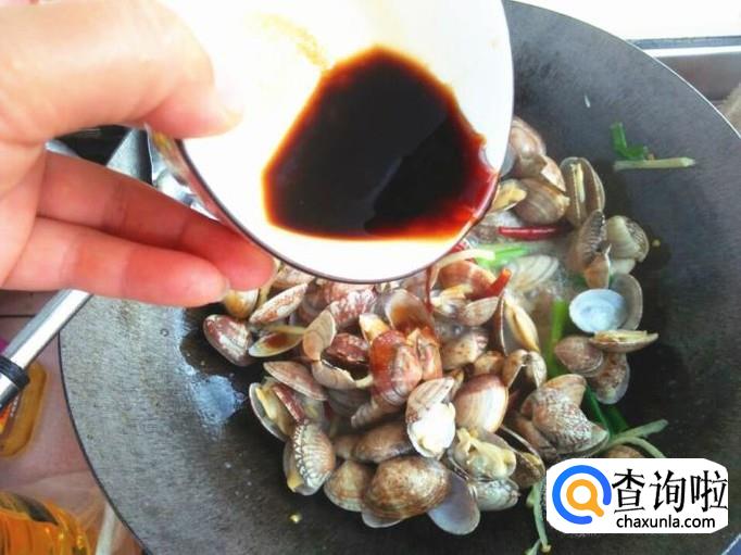 等到花蚬子全部张开口的时候,碗里加上一勺生抽、一勺蚝油、一点食盐,再加上一点点味素,再来一点点淀粉,将其调匀,并徐徐倒进锅里,然后快速翻炒几下。