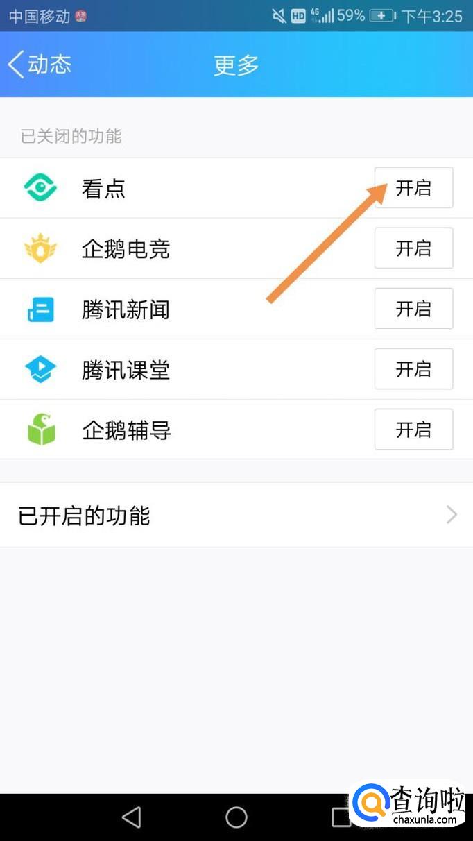 更多里面,可以看到有看点,然后点击开启,如下图。