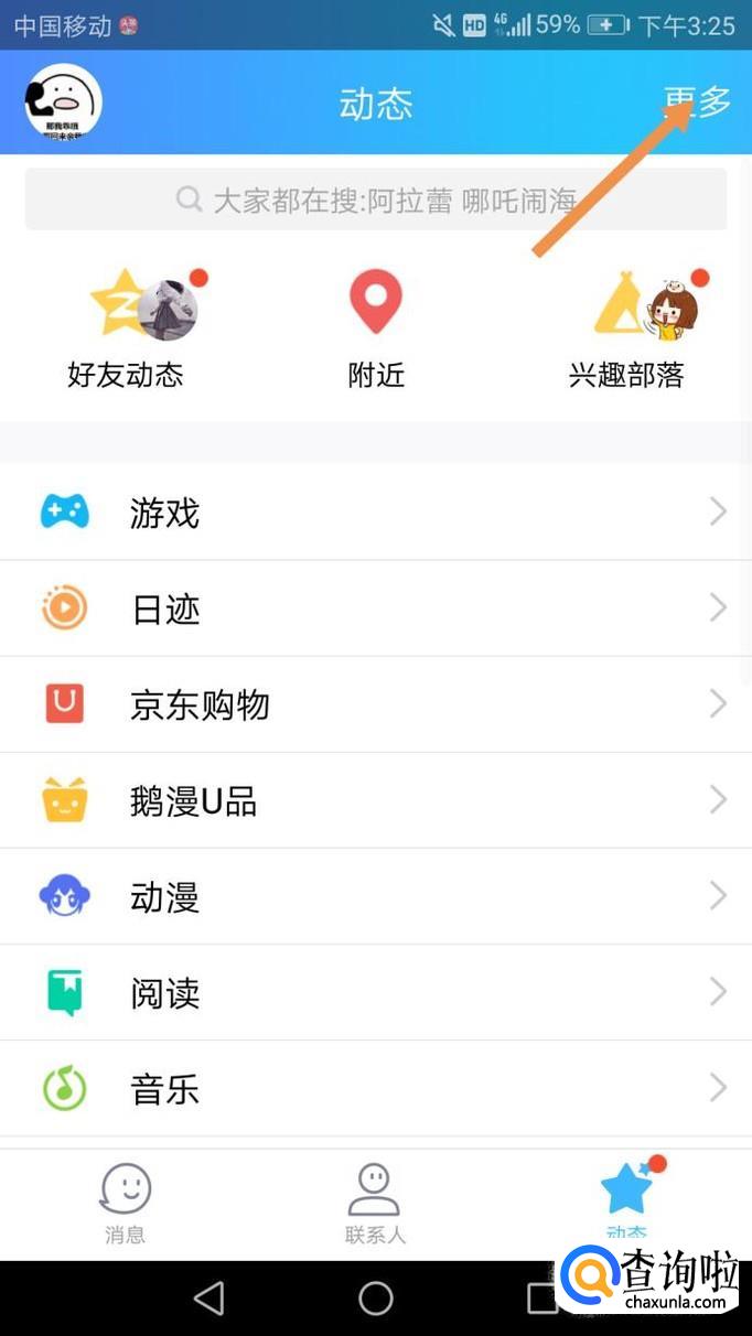 首先打开QQ,点击动态,然后打开右上角的更多,如下图。