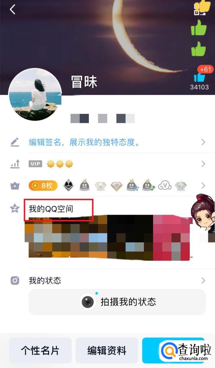 打开手机QQ,点击个人头像进入以下页面,点击网名一栏。