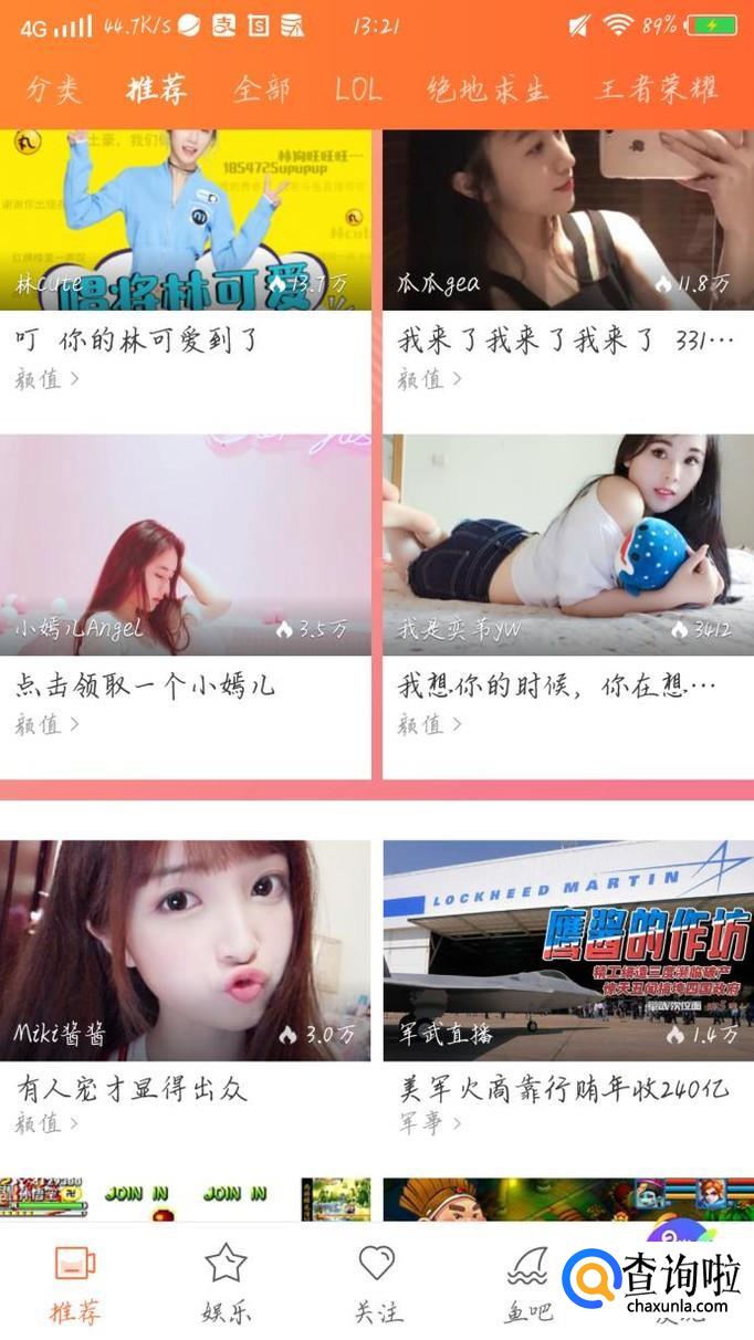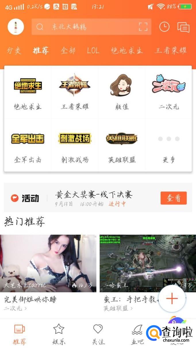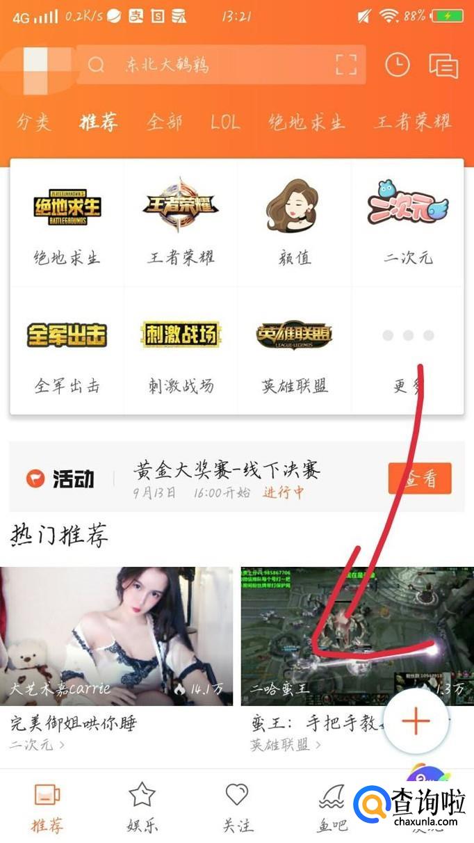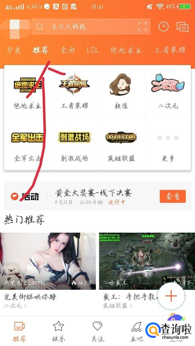 在搜索框中输入你想要看的视频或者主播的名字,如果实在想不出来,可以点击“推荐”如图1箭头所示。