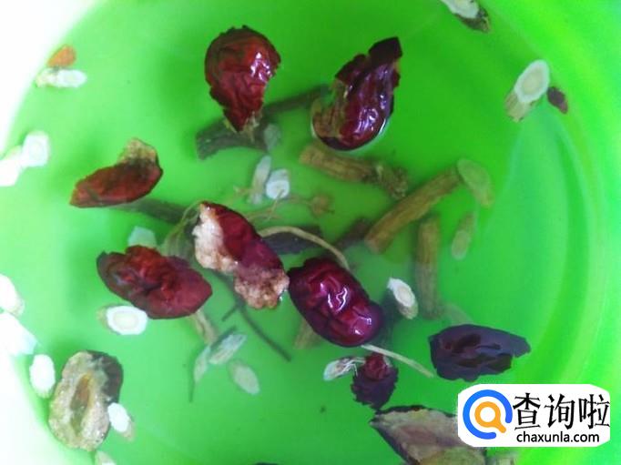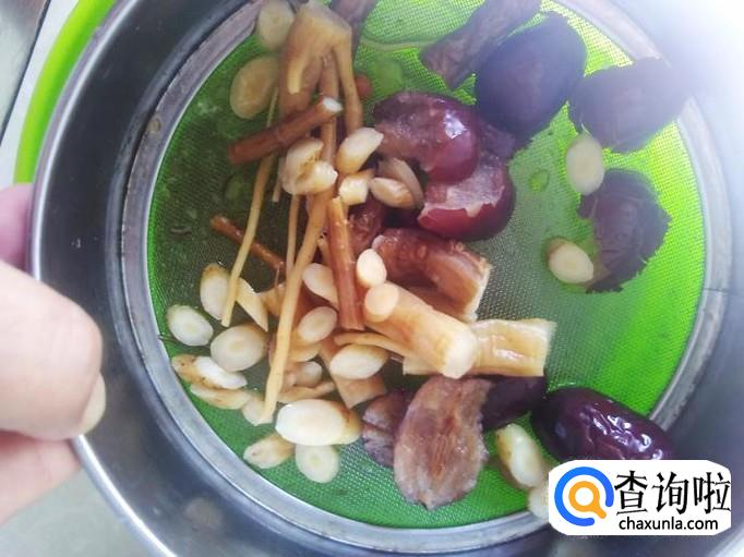 红枣撕成两边放和药材放到水里清洗干净。