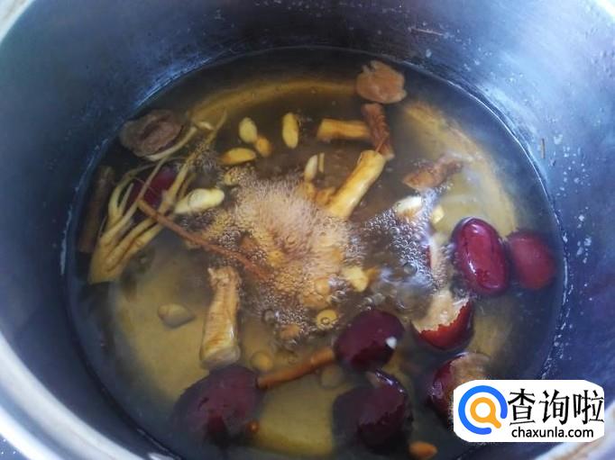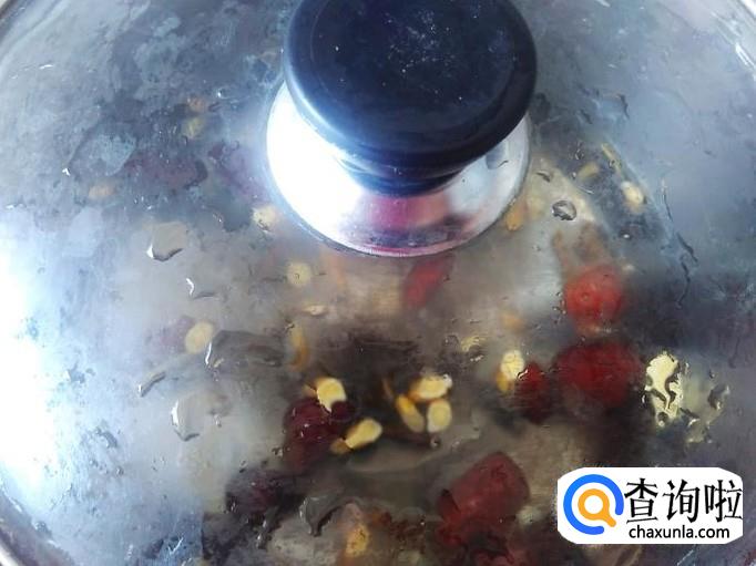 然后捞上来放到锅里,加4碗水进去盖上锅盖大火煮沸转小火。【枸杞先不要放进去,因为枸杞很容易煲烂】
