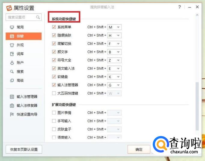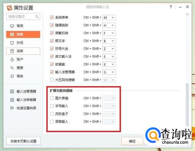 扩展功能快捷键设置,图片表情、手写输入、皮肤盒子、语音输入的设置,ctrl+shift是固定的,其后面加的热键可以根据习惯更改,如图所示