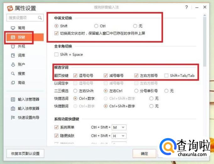 进入设置属性后,即可看到中英文切换的热键,系统默认的是“shift”,也可根据使用习惯更改;候选字词热键一般不常用,可根据使用习惯更改,如图所示