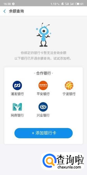目前只有浦发银行、平安银行、宁波银行、网商银行、兴业银行这五家银行与支付宝进行合作,可在支付宝查询银行卡余额。