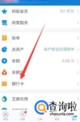 在支付宝“我”页面点击“银行卡”,进入下一页面,如图所示。