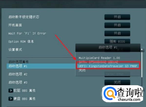 回车确认后弹出如下图“启动选项#1”选择菜单,按键盘“上下方向键”切换到“U盘”即可。