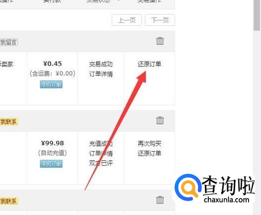 进入之后,找到自己想要还原的订单,点击“还原订单”即可,如图所示。