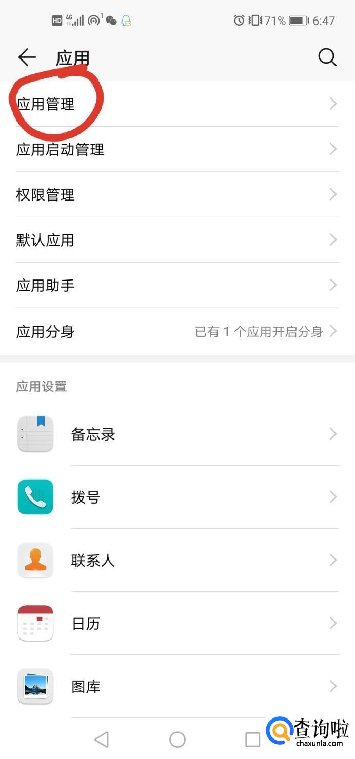 以华为V20为例(其它安卓机相似),进入手机设置,找到应用管理,进入后点击“微信”。