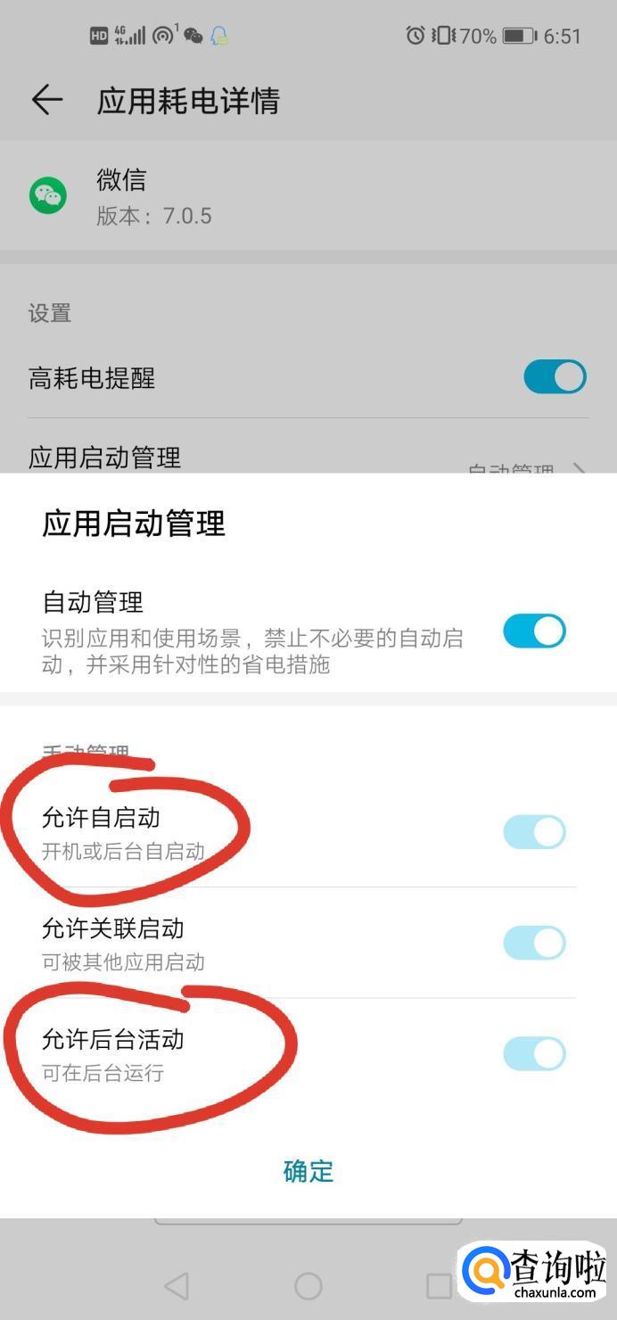 返回到应用信息界面,点电池进入,像图中所示,“允许自启动”“启动后台活动”为开启。