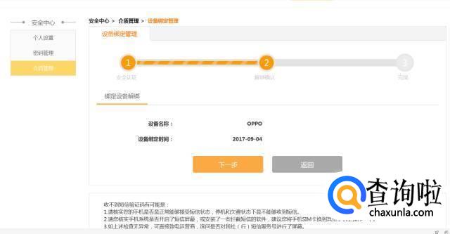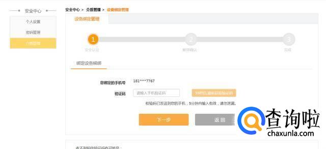 接下来,我们点击获取“验证码”,这时你所绑定的设备就会收到一条验证码,输入验证码再点击“下一步”。