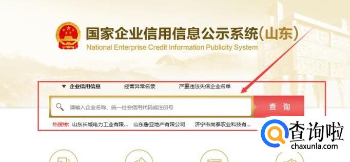 进入山东省企业信用信息公示系统,在主页面的搜索框中填入要搜索的公司名称即可,如图所示。