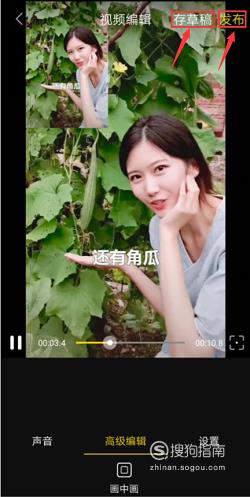 返回视频编辑页面后,可点击“存草稿”将视频保存至本地,也可以点击“发布”快速分享给好友。