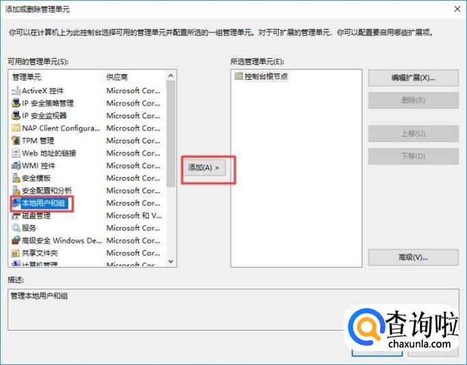 然后我们找到本地用户和组,之后我们选中,然后点击添加;