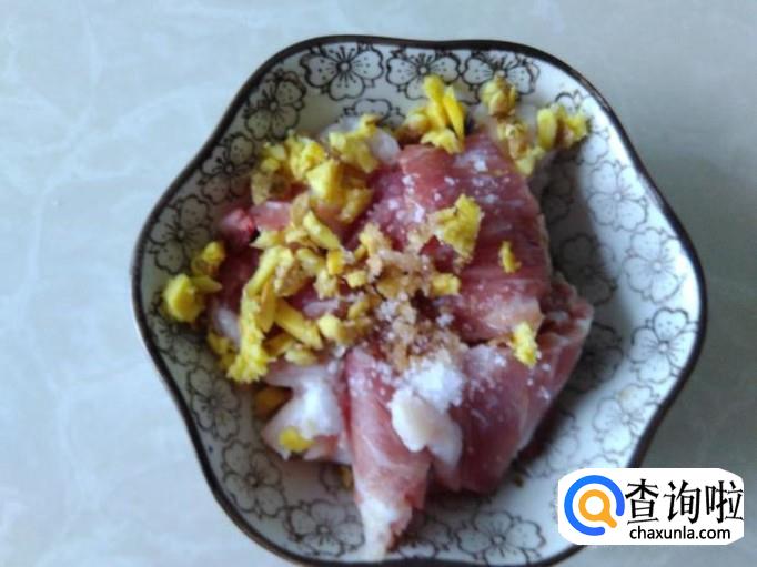 瘦肉切成薄片,加盐、姜蓉、生抽、料酒腌制几分钟。