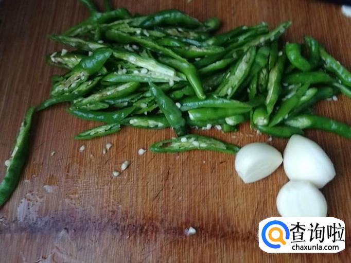 青辣椒去蒂,清水洗净后切片,大蒜去皮后清水洗净切片。