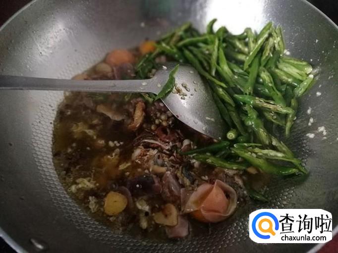下鸡杂翻炒变色后,加适量白酒去腥 ,再加入青青辣椒翻炒。