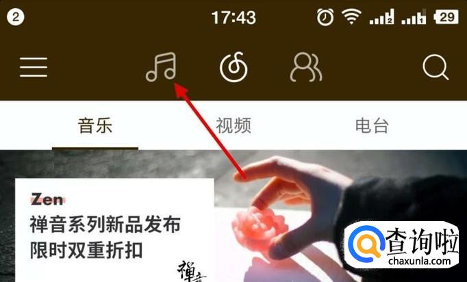 进入网易云音乐后,我们点击顶部导航中的“音乐符号”。如图