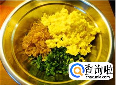 鸡蛋打进油锅里做成鸡蛋碎放凉,放进韭菜末里,再抓上一把虾皮,加上食盐搅拌均匀。