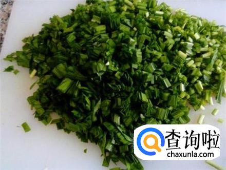 韭菜择干净,盆里加一些苏打粉,用清水化开,韭菜放进去浸泡一段时间,捞出来控干水分,切成韭菜末。