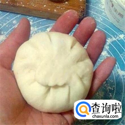 清水和面,醒面半小时,揪成面剂子擀成面皮,中间厚四周薄,里面放上韭菜馅包起来,然后用手压一下。