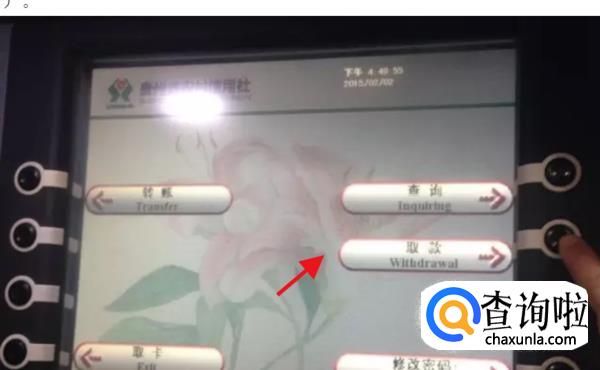 密码输入正确之后,你在屏幕上可以看到“查询”、“取款”、“转账”、“取卡”等选项,就是屏幕两边的8个按键,不要着急,看清了再按选项旁边对应的键。此时,选择“取款”服务(如果是触摸屏,用手指按对应文字即可,如果不是触摸屏,则需要按旁边对应的按钮)。