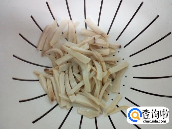 杏鲍菇用水焯一下,焯至杏鲍菇变软(大约一分钟的时间)捞出,沥干水分。