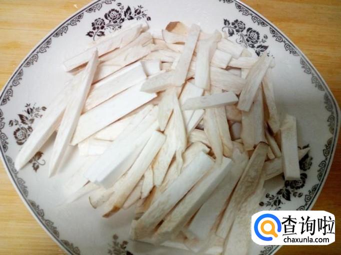 杏鲍菇用水清洗干净,控干水分,切成条。