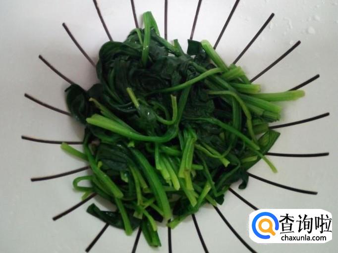 菠菜用水焯一下,水开后入锅30秒钟捞出,迅速用冷水过凉,沥干水分,然后再用手攥一下菠菜里的水分。