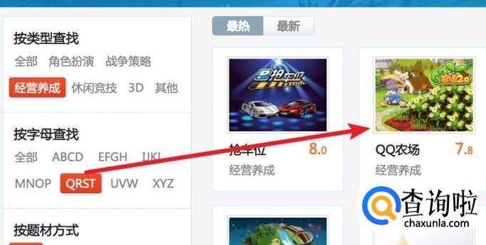 在找游戏的页面,我们点击左边的按字母查找,然后在右边就可以看到‘QQ农场’了,点击进入。