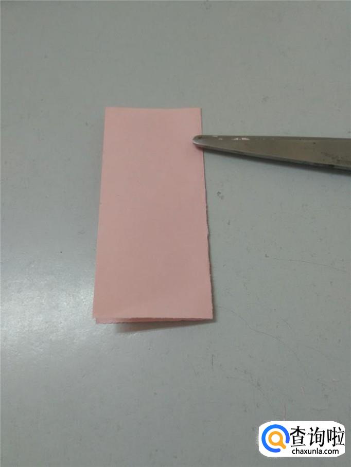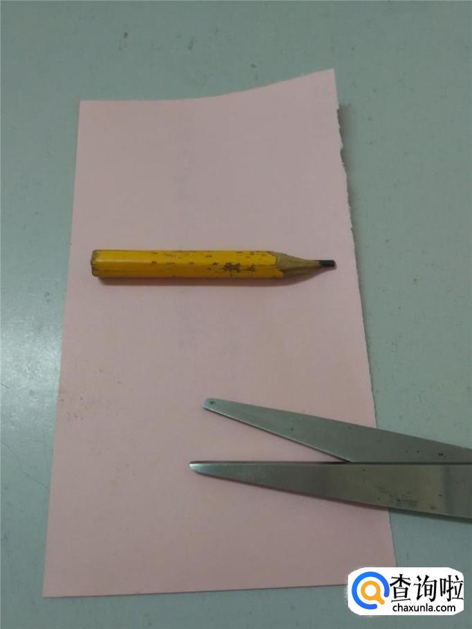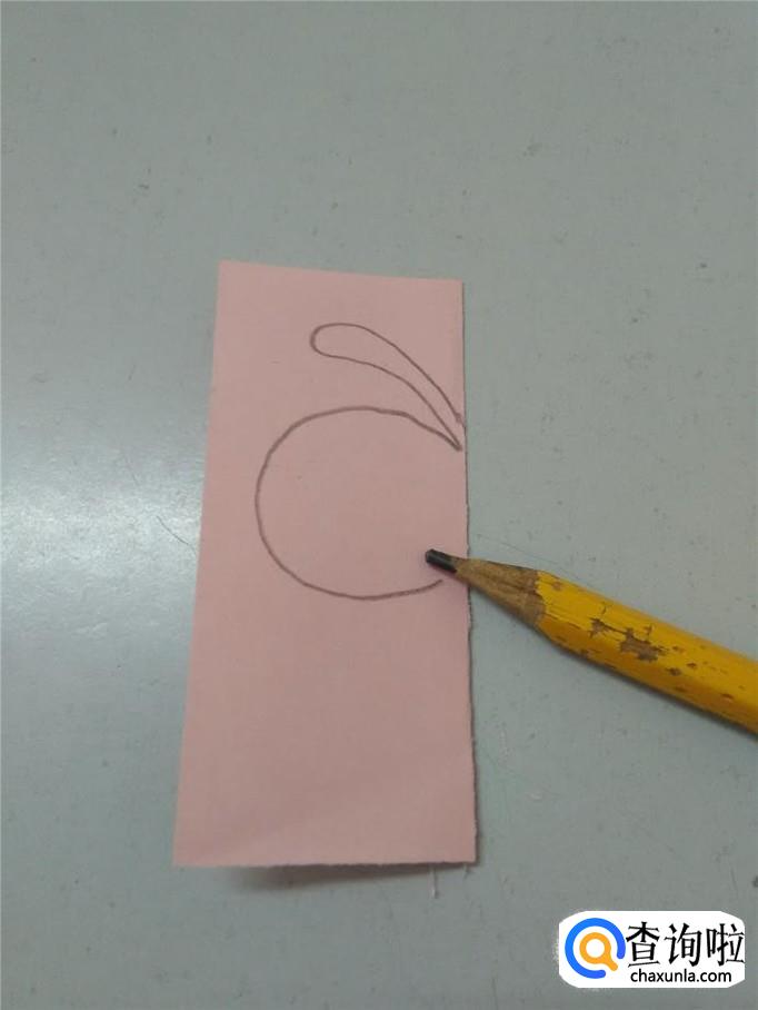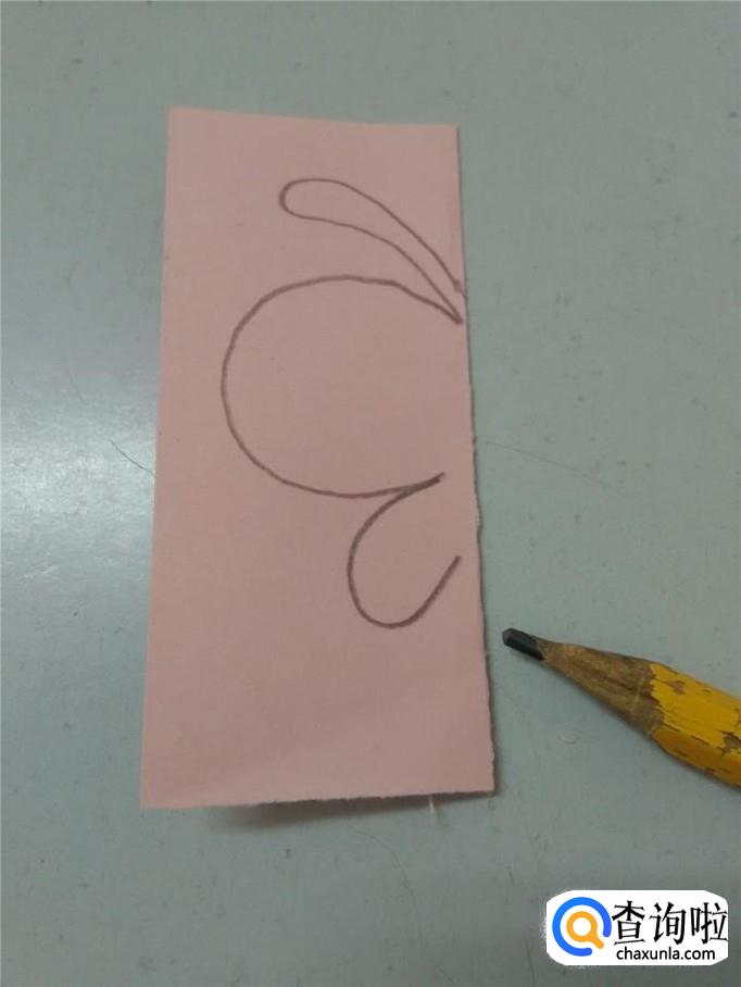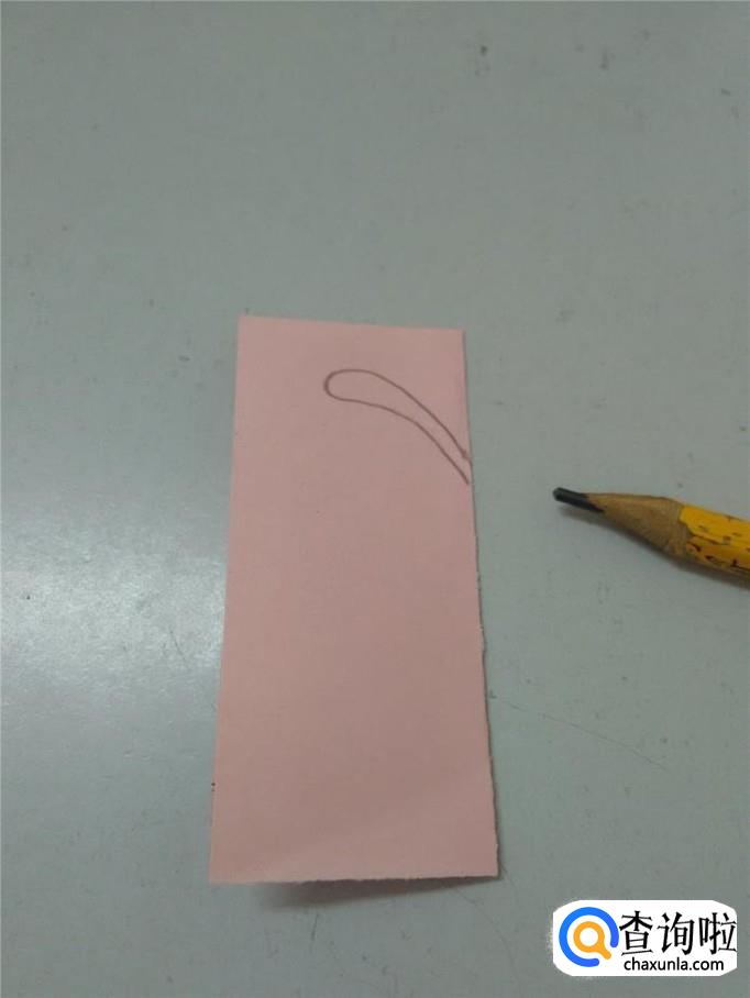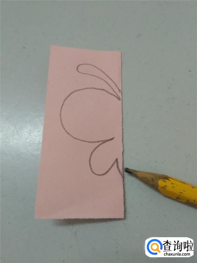 用铅笔在彩纸上靠近右侧的地方,画出一个长条的形状,左端宽一点,右端画到彩纸折叠处,这是蝴蝶的触角。