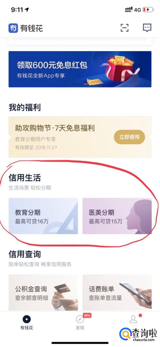 在有钱花APP首页中,找到信用生活中的“教育分期”,然后点击进入教育分期。