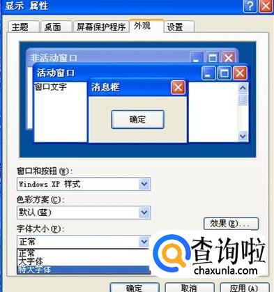 然后在显示属性界面点击上方的“外观”,接着在下边的“字体大小”里点击旁边的下拉箭头,选择“特大字体”,再点击“应用”或“确定”就可以了。