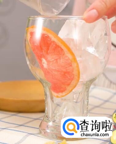 杯中放入一片西柚做装饰,倒入冰块。