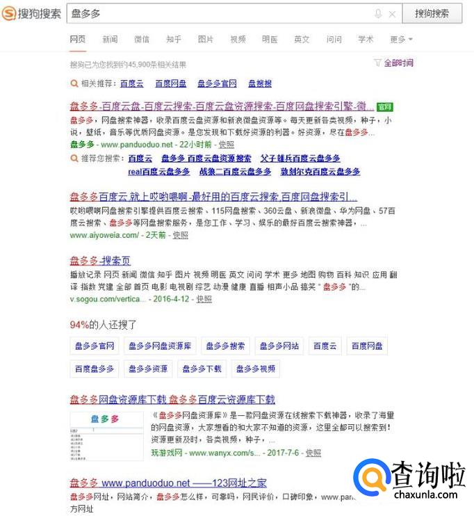 第一种方法虽然直接,但效率不高,我们可以通过专门的搜索百度云资源的网站进行搜索,即打开搜狗浏览器,搜索盘多多,然后进入网站,就可以搜索我们想要的资源了
