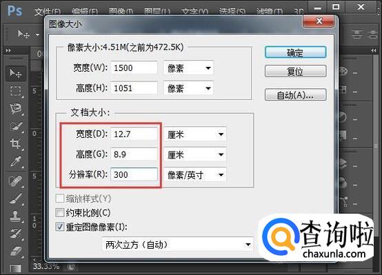 首先,打开要打印的相片,按Alt+Ctrl+I打开图像大小,设置宽度12.7厘米,高度8.9厘米,分辨率300像素/英寸(5寸相片大小)。如图。