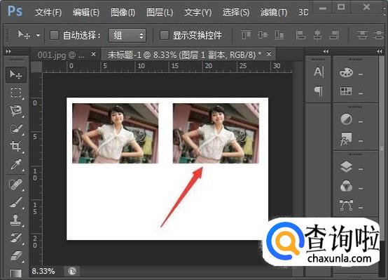 把相片放到工作区的左上方,如图所示位置,再按住Ctrl+Alt键不放,按住相片往右拉到如图所示位置放手,就可以复制出第二张。
