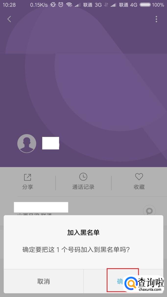 最后,页面底部会弹出对话框,我们点击“确定”按钮,然后该号码即被拉入黑名单,再也不会骚扰我们了。