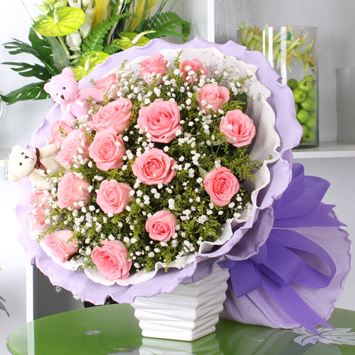 很多女人都希望自己永远不老,永远有人爱,在自己的爱人心中犹如少女一般,因此,不少人都会选择一束粉玫瑰来表达自己对所爱女人表达这样的祝福,在送粉玫瑰的时候,我们还可以加上一些粉色的配花,最常见的配花就是粉色满天星,粉色玫瑰加满天星的花语是青春青涩的爱,粉色给人的感觉就是青春,满天星的花语又有爱的含义,因此为青春青涩的爱。还寓意着不可或缺的爱,粉色虽然没有其他颜色这么浓烈,但是一直陪伴在身边,表示不可或缺。另外,粉色的满天星多是和玫瑰捆绑在一起,因此花语中表达的是配角之爱。