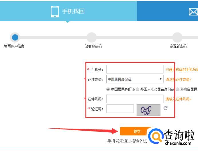 进入之后,选择“手机找回”,填写“手机号、证件号和验证码”,点击“提交”。