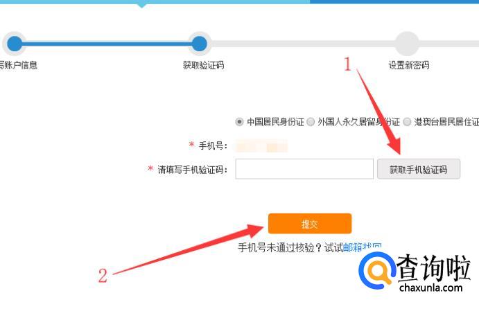点击“获取手机验证码”并填写进去,点击“提交”,如图所示。